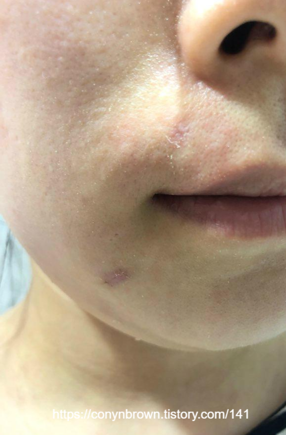 위에 점은 작아서 그런지 실밥 자국만 살짝 남고 거의다 아물었다. 아래부분은 붉은기도 많이 남았고, 옆의 피부보다 살짝 볼록한게 느껴져서 수술이 잘 안된건지, 수술 후 붓기때문에 볼록한건 지 약간 불안불안했다.