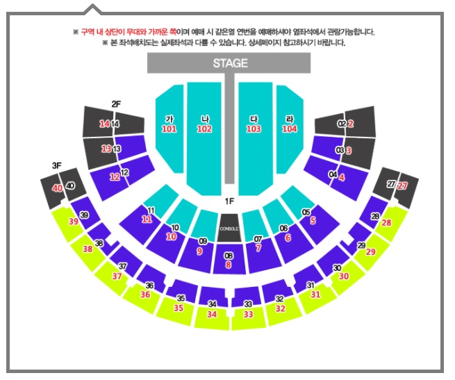 무대가 T자형 스테이지라 나, 다구역이 제일 빨리 없어지고 그 다음이 가, 라구역 > 나머지 R석 > S석 > A석임.