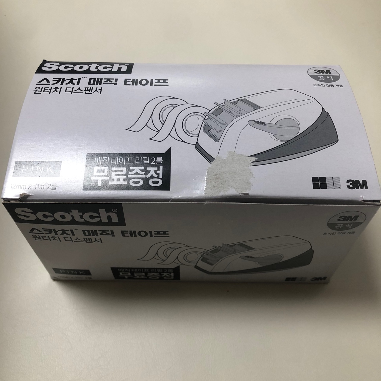 디스펜서+매직테이프(불투명한 테이프) 2롤이 세트고, 사은품으로 투명테이프 2롤, 도넛모양 테이프 케이스를 받음.
