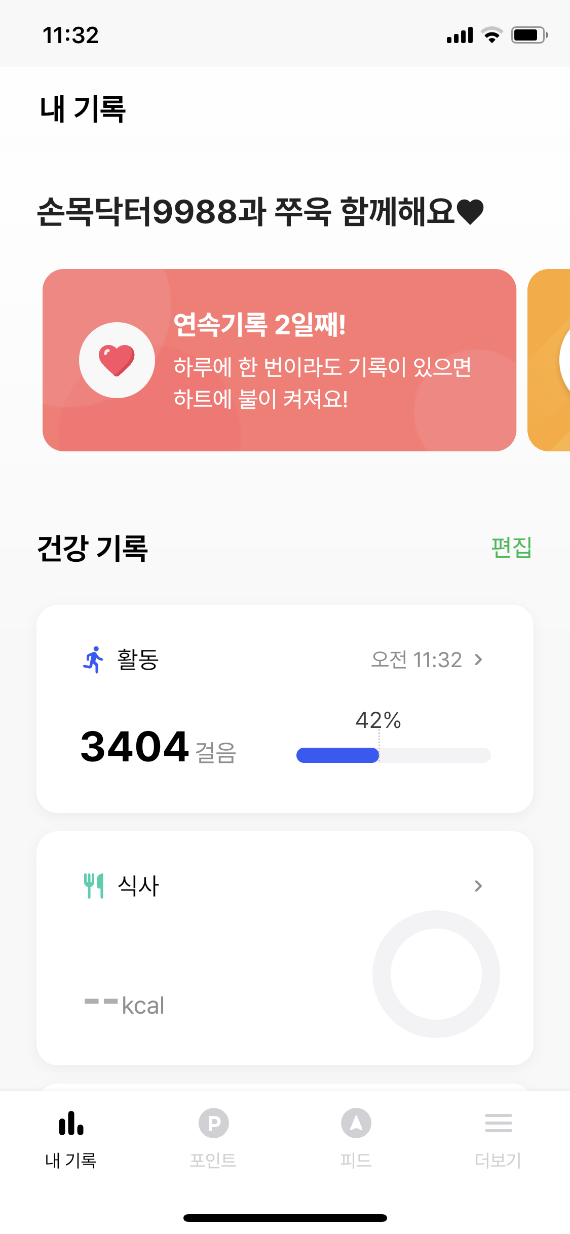 어플로 돌아와 다시 아래로 당겨 기록 업데이트 하면 된다! 하루 8천보 걸으면 200포인트가 쌓인다고 하니 열심히 해봐야겠다.
