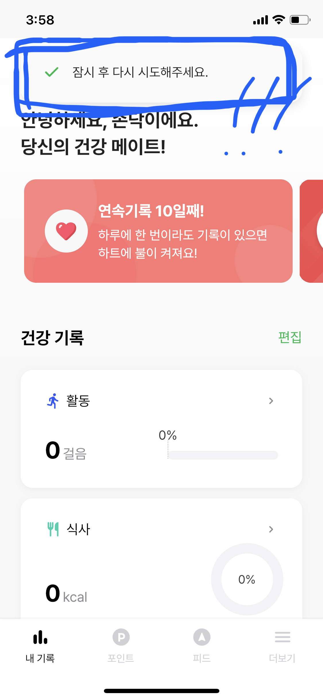 운동 후 기록 업데이트 할 경우에도 오류가 날때가 자주 있다. (어플 완성도 무엇..) 위와같이 잠시 후 다시 시도해주세요. 라는 메세지가 반복적으로 나올 경우에는