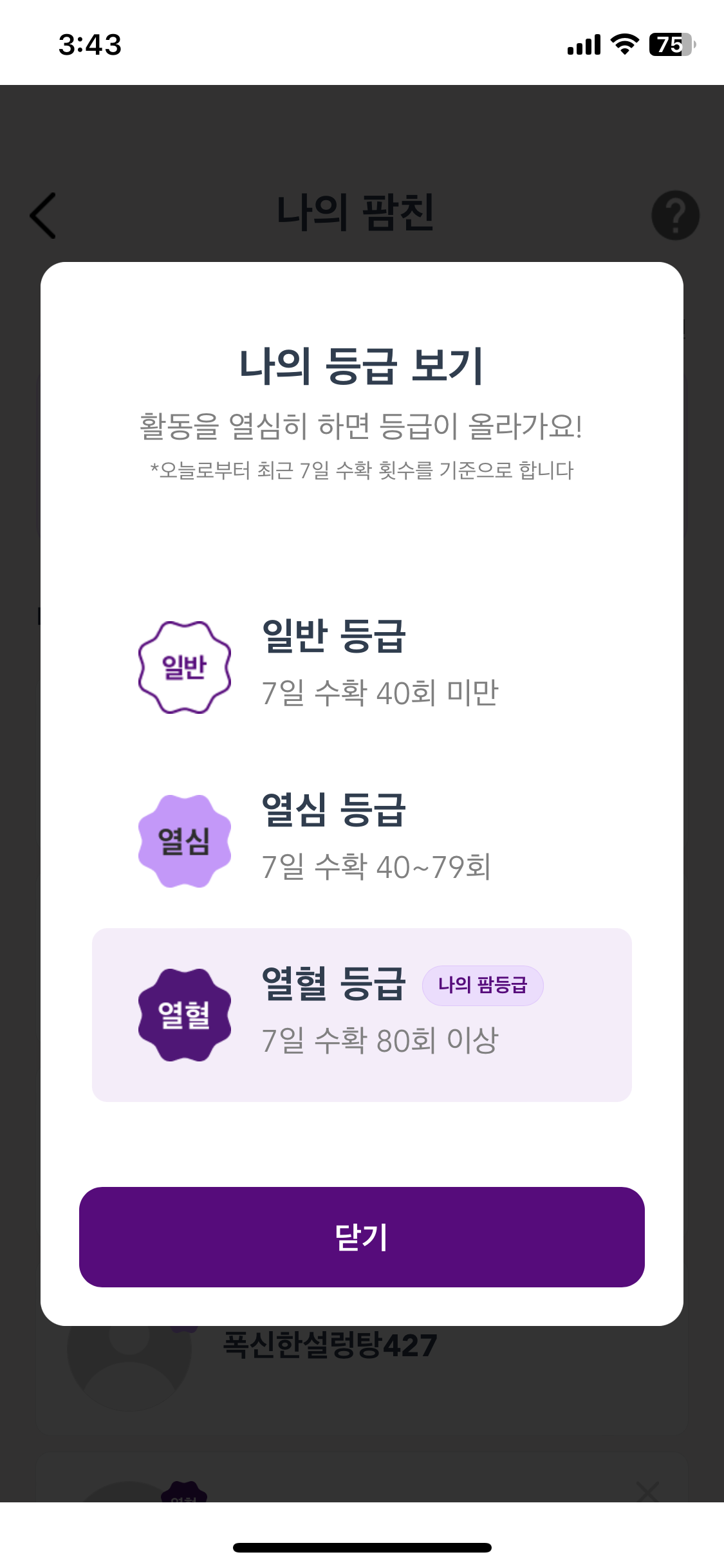 얼마나 자주 컬리팜을 들여보는지의 척도가 등급으로 나온다. 나의 경우는 열혈등급인데