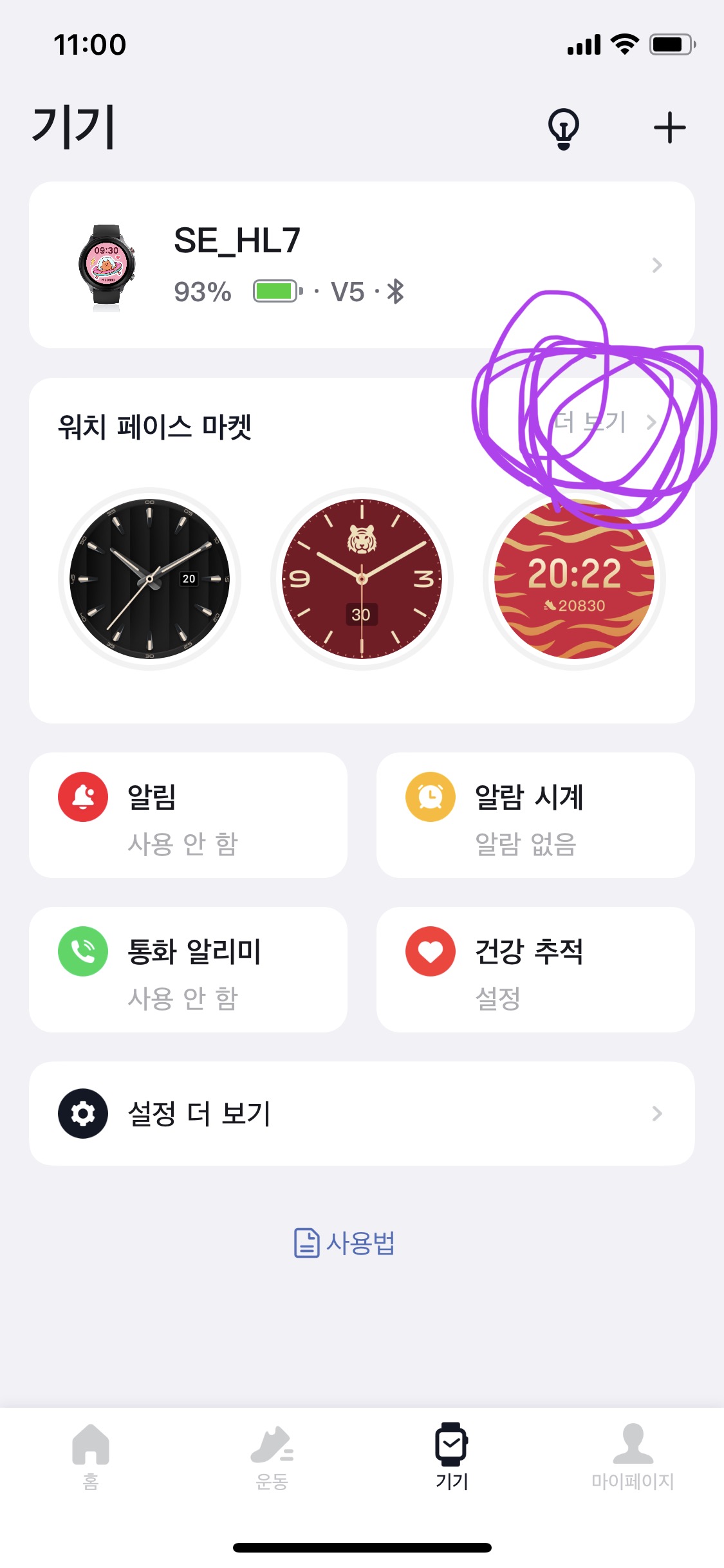 1. VeryFit 어플에서 기기연동 후 워치페이스 마켓 더보기